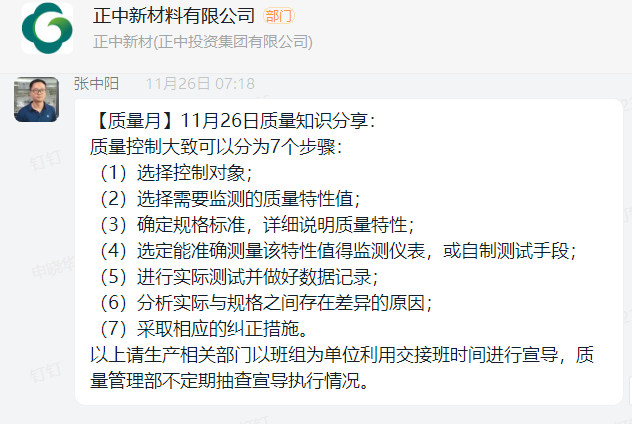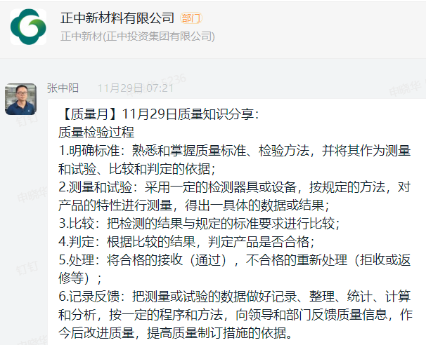 “每日在全员群分享质量管理知识,不断强化员工的质量意识,使质量的重要性深 入到每位员工的血液中。