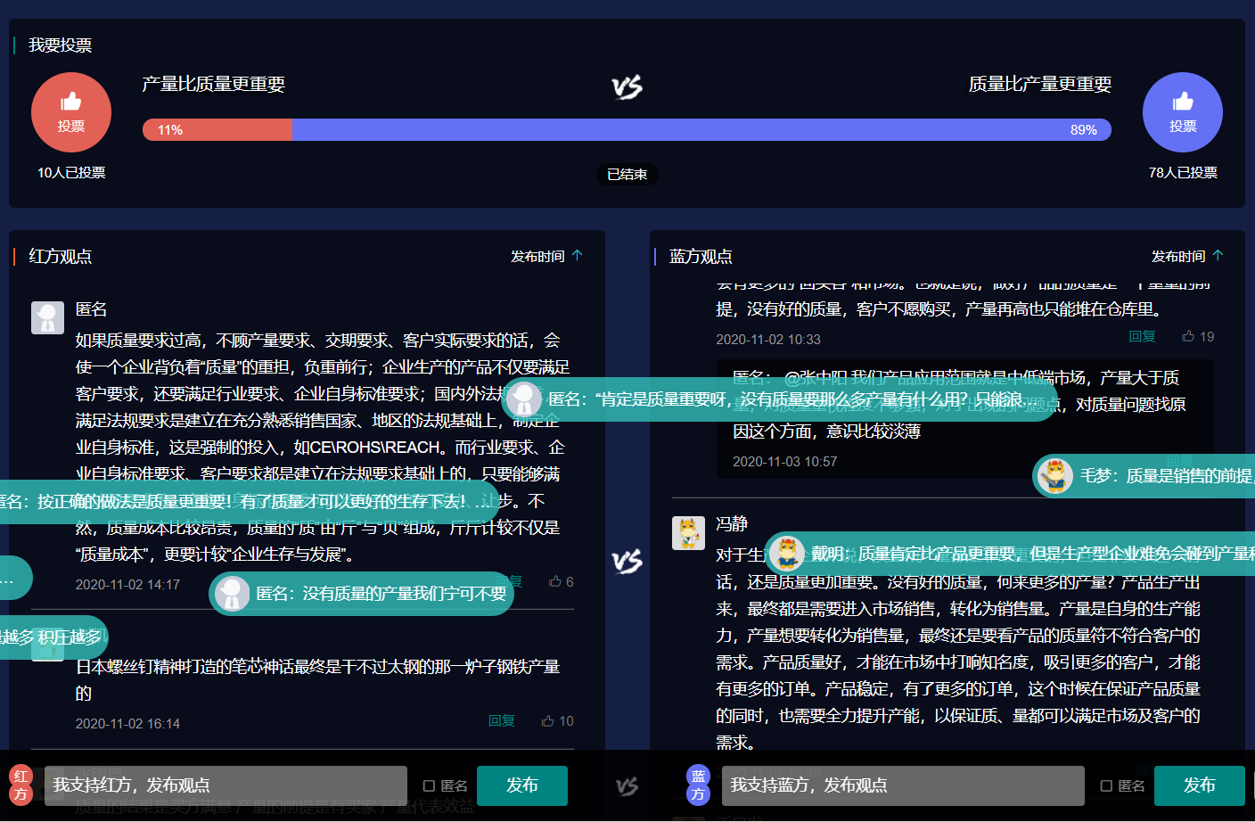 围绕“产量与质量谁比较重要”这一话题展开激烈讨论,智慧的交锋,知识的碰撞 ,质量意识的不断深入。红方观点:质量是企业生存的根基,是业界信誉的保障。质量重要, 没有质量谈何产量 ,地基没打好怎么盖大楼。蓝方观点"拿产量和质量对比,要找到一个平衡点,质量是产品的生命,产量是利润的保障,在保证质量的基础上,提高产量。