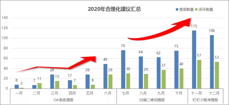 合理化建议有计划,有要求,有考核,有落实,全员勇于创新,合理化建议提案数量不断创造新高,2020年全年共提报合理化建议635件,闭环317件,全年节省和创造直接经济效益总计170.1万元。尤其第四季度,合理化建议提报和闭环数量更是取得重大突破。