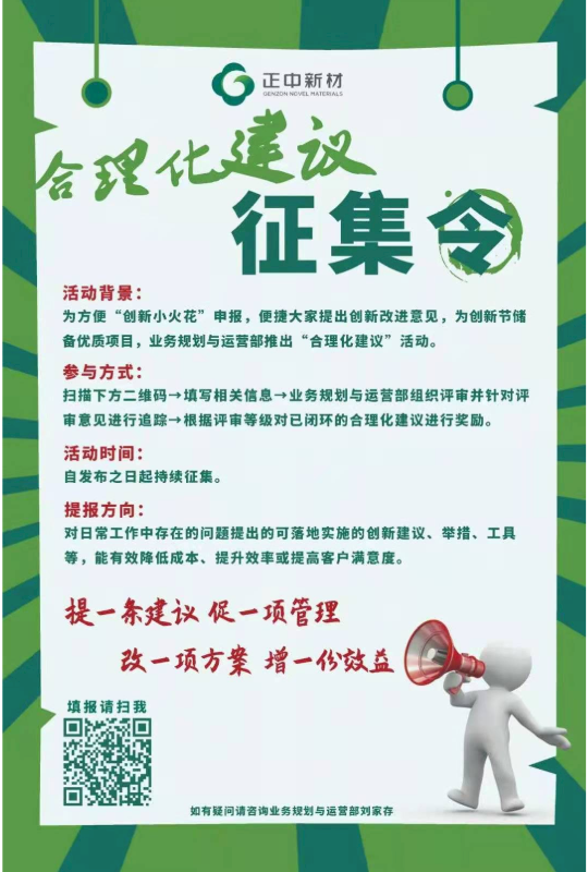 以降低制造成本、提高生产效率为主题,推动新技术、新工艺、新方法的持续创新,2020年科泽新材开展了合理化建议体系,旨在深挖企业内部创新源动力,不断提升生产效率,提高产品质量,并开展向先进标杆学习,号召全员参与积极提报,持续改善创新。