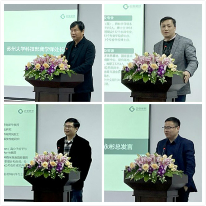 龚学锋处长、张正彪主任分别代表苏州大学、材料与化学化工部对“新型功能高分子材料联合创新中心”的成立表示热烈的祝贺,表达了对双方产学研合作的认可及未来发展的期许。屠迎锋教授就课题组成员及所研究课题方向作了详细介绍,其长年研究的嵌段共聚物、高性能聚酯和液晶高分子、光学补偿膜均与科泽新材当下及未来的研发战略高度契合。科泽新材副总经理赵永彬针对正中集团、科泽新材的发展历程及正中产业研究院当下的战略规划、产业布局、组织架构及联合创新中心情况做了详尽解读,并高度展望了与苏大合作的重要意义、广阔前景和目标必达的信心。
