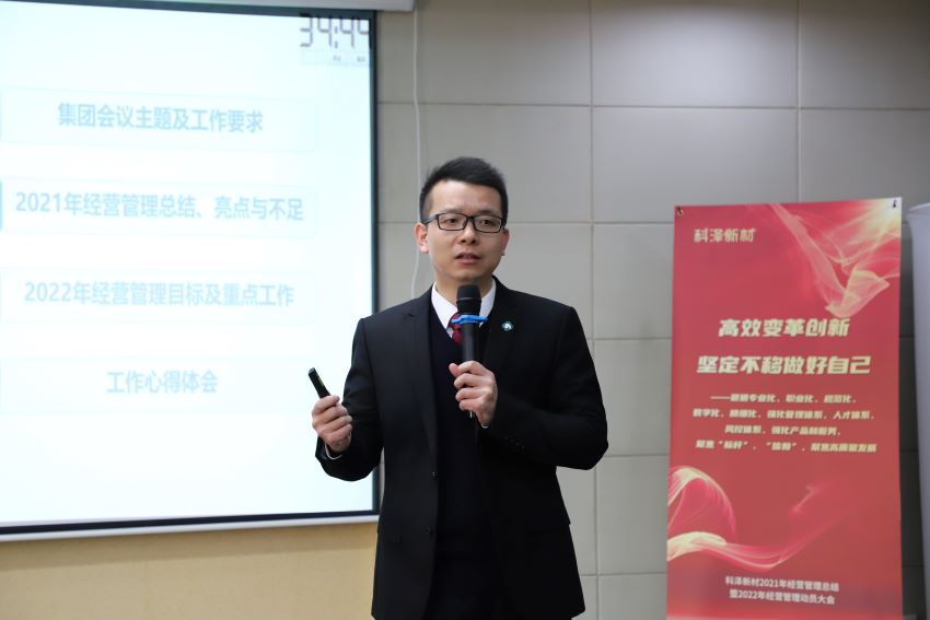 随后,谢鑫对科泽新材2021年经营管理进行了系统回顾,总结亮点与不足,并对2022年重点工作作出部署。谢鑫指出,2021年通过公司上下团结一心、砥砺奋斗,较好的应对外部市场变化,较圆满的完成各项经营指标,战略业务获得突破,经营管理和文化建设取得明显进步。2022年为有效应对挑战、更好实现科泽发展目标,科泽新材将围绕“降成本、创利润、塑品牌、强化产品线管理、聚焦高价值客户、打赢战略业务攻坚战”为发展主题开展各项工作,并阐述说明了“降成本”、“创利润”等各项子发展主题的具体行动路径和举措。