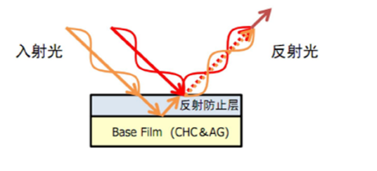 2 AR防反射:光线在防反射层上产生二次反射,会和原反射光产生干涉,利用不同光学材料HC层产生的干涉效果来消除入射光和反射光,从而减弱反射光,达到防反射功能